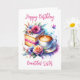 Um pedaço bonito de bolo com estilo aquarela ai com flores rosa e roxas ao lado de uma xícara de café ou cartão de aniversário floral bonito.