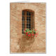 Uma janela arqueada velha ajustou-se em uma parede de tijolo velha com as flores vermelhas que decoram a caixa de janela