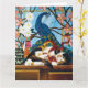 Um gato calico brincando com um dragão chinês vermelho em frente a uma janela de vidro manchado de pavão.
