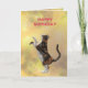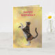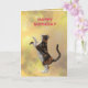 Um gato calico americano de cabelos curtos nas pernas traseiras brincando com uma mensagem de aniversário.