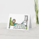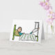 O design da cama de hospital mostra um boneco de palito deitado na cama com a perna quebrada engessada levantada acima. Almofadas confortáveis e uma atitude resignada relaxada em relação à estadia no hospital.