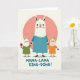 This card shows three stylized camelid figures standing close together on an off-white background, with a tall central figure between two smaller companions. A large salmon-pink circle sits behind the central figure like a soft halo, adding a cozy, protective feel ❤️. Each character has a creamy white face, slim black ears, simple black dot eyes, and rosy cheeks, and their gentle expressions and slight lean toward one another suggest quiet affection. They wear plain tunic-like outfits with jagged fleece-like necklines: teal-blue on the tallest figure, olive green on one smaller figure, and warm orange on the other. Their hands meet in the middle, creating a linked chain that reads like a caring family moment or close friendship. Near the bottom of the design, a short line of small black text is placed as a simple caption beneath the figures. The smallest figure on the left holds a bright red lollipop, and a tiny 🌼 detail sits nearby in the lower area.