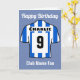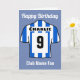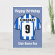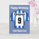 Personalize este cartão de aniversário de camisa do clube de futebol com um nome, número e nome do clube de futebol. Listras azuis e brancas. Feliz fã de futebol de aniversário. Cartão para um apoiante furioso.