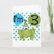 Os amantes do sapo vão adorar este aniversário de 3 anos Sapo azul giro com o sapo verde vestindo um chapéu de festa, bolinhas e balões azuis e verdes, e texto que diz "Eu tenho 3".