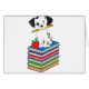 Um filhote de cachorro dalmatian com um lápis em sua boca está sentando-se em uma pilha de livros. Personalize este produto com um nome ou uma mensagem para fazê-la verdadeiramente original