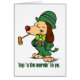 Cachorro Leprechaun com um cachimbo e roupas verdes desejando "Top 'o da manhã' para você."