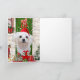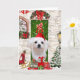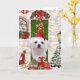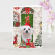 Cão Maltês Natal sentado fora de casa decorada com coroa de Natal, árvore de Natal é uma ideia perfeita de presente de Natal para amantes de cães.