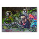 Olhos de cobra olhando para ele, um homem com jaqueta jeans, camisa vermelha-branca e graxa no cabelo, um grafite rochoso do 50º estilo em viena áustria em donaukanl