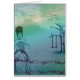Menina que faz malha fora. Matiz azul. Arame farpado e uma árvore com um balanço. Igualmente alguns passarinhos. Seu um cartão doce bonito!