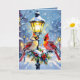 A beautiful Christmas card with an impasto style ai illustration of a female and male cardinal sitting on a lamppost on a snowy winter night. A back drop of a cute festive street and village. On the inside of the card you can add your own custom message in the personalize area.