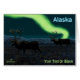 Duas renas-de-coleira (Rangifer tarandus), também conhecida como rena, caminham a tundra à noite enquanto migram para sul durante o inverno. A geada está no chão e as luzes do Norte brilham acima de montanhas distantes. Texto lendo "Alaska" aparece em azul e branco brilhantes Adicionar seu próprio texto adicional.