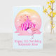 Carnaval do Friso Flamingo Kids 5, cartão de saudação de aniversário para seus pequenos especiais. Meninas de todas as idades vão adorar esta cena fofinha com um doce rosado de algodão rosa-rosa comendo flamingo fora da feira, com passeios no parque de diversões ao fundo. Texto personalizado na frente e no dentro para que você possa personalizá-lo da maneira que quiser.