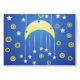 Esta design apresenta um móvel de lua com estrelas penduradas nela. O fundo é azul, como no céu noturno. Estrelas e círculos o cercam. Você pode personalizar este cartão com seu próprio texto ou dizendo selecionando "personalizar". Faz um maravilhoso convite para chás de fraldas, anúncio para bebês, cartão para parabéns ou cartão de saudação.