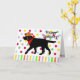 Design de Cartoon Labrador Retriever Whimsy e engraçado criada por Naomi Ochiai do Japão. Dons de diversão excelente para amantes de cães que amam Labradores. Um Labrador Negro de boa aparência está caminhando com seu chapéu favorito na cabeça. Você pode personalizar texto e muito mais! Listras coloridas e padrão de bolinhas com balões dentro para o Black Lab Cowboy, design de Cartão de Aniversário da Cowboy.