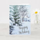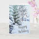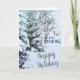 Um Cartões de natal feliz com árvores cobertas de neve e um lar tradicional. Rótulo de devolução de endereço correspondente. https://www.zazzle.com/z/pejvr?rf=238828267405258083