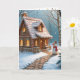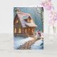 Uma casa de gengibre baleeira está aninhada em uma floresta nevada, iluminada calorosamente por dentro, à medida que um boneco de neve espera em uma pista de pedra' O texto de dentro pode ser mudado.