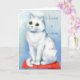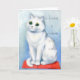 Esta bela carta para amantes de gatos ilustra um lindo gato branco sentado de uma almofada vermelha confortável, olhando muito em casa. A ilustração é do famoso artista inglês Louis Wain. Na parte frontal do cartão, lê-se Home é onde está o gato. O cartão seria perfeito para amigos e familiares que amam gatos.