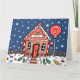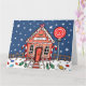 Uma ilustração colorida de uma casa festiva de pão de gengibre. O exterior da casa é decorado com duas canetas doces e tem uma grande árvore pirulito no jardim. O chão está coberto de neve brilhante e branca com açúcar em gelo, e está coberto com doces.