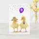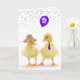 Patos amarelos bonitos com um balão de 13 de aniversário roxo e confete de festa em fundo branco. O pato está vestindo uma corda de pérolas e um capô. O pato está vestindo uma gravata listrada. Todo o texto pode ser alterado. A idade pode ser editada. A cor de fundo pode ser alterada.