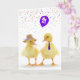 Patos amarelos bonitos com um balão de aniversário de 21 anos roxo e confete de festas sobre fundo branco. O pato está vestindo uma corda de pérolas e um capô. O pato está vestindo uma gravata listrada. Todo o texto pode ser alterado. A idade pode ser editada. A cor de fundo pode ser alterada.