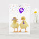 Patos amarelos bonitos com um balão de aniversário de 30 anos roxo e confete de festas sobre fundo branco. O pato está vestindo uma corda de pérolas e um capô. O pato está vestindo uma gravata listrada. Todo o texto pode ser alterado. A idade pode ser editada. A cor de fundo pode ser alterada.