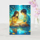 Um doce cartão de Feliz dia de os namorados que representa um menino e uma menina de anime sentados do lado de fora falando com um fundo romântico e um reflexo de água bonito. No verso está uma página de colorir onde você pode personalizar os nomes. Dia de os namorados para ele ou para ela.