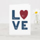 Compartilhe algum amor com o casal feliz com este cartão de casamento personalizado. Ele apresenta um olhar moderno industrialista com um gráfico ousado em um estilo angustiado que soletra a palavra LOVE com um coração para O em azul marinho e vermelho escuro. A mensagem dentro em uma fonte de máquina de escrever azul marinho está pronta para seu toque personalizado.