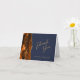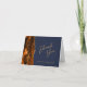 A borda esquerda deste elegante obrigado de casamento plano... você tem um design de agate laranja queimado, cortado com brilho dourado. O texto está em um script dourado e sans serif fonts em um fundo azul marinho.