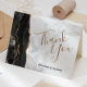 Este elegante e moderno cartões de agradecimentos de casamento apresenta uma coloração aquosa preta, borda agitada, aparada com falsa brilho dourado. O texto personalizável combina as palavras "Obrigado" em um guião de escrita manuscrita dourada e os nomes da noiva e do noivo em preto itálico em uma cinza e fundo de mármore branco.