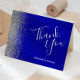 Este elegante cartões de agradecimentos de casamento moderno apresenta uma borda de cintilação prateada em um fundo azul real. O texto personalizável combina as palavras "Obrigado" em escrito branco e os nomes da noiva e do noivo em letra itálico.
