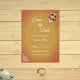 Elegante ouro marrom com teracotta brilha romântico Salve o Cartão de Casamento de Data. A flor do crisântemo no lado frontal e dois corações no lado traseiro podem ser personalizados. Ideal para casais que acreditam no amor eterno e num jogo feito no céu. A flor do crisântemo significa realeza.