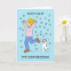 Uma simples ilustração de uma senhora loira cabeleira e um gato branco correndo por confete em pânico. A imagem é definida em relação a um fundo de cor azul pálido. Uma carta divertida para enviar a qualquer noiva que esteja começando a entrar em pânico sobre seus arranjos de casamento!