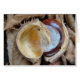 Castanho, seco de casca a, uma castanha-da-índia com dois metades antes de folhas e pano de fundo escuro é ser ver em este cartão. O cartão é em branco.