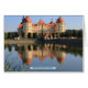 Castelo de Moritzburg, Alemanha, com cúpulas laranja, barroca nas quatro torres e as paredes amarelas refletindo no lago.