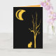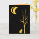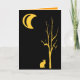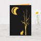 Este cartão de Halloween contém um gato ouro amarelo debaixo de uma árvore de ouro nua sob uma lua estilizada, olhando para você contra um fundo preto profundo.