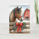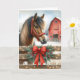 Cartão de Natal personalizado. Um bonito cavalo marrom em frente a um celeiro rústico vermelho atrás de uma cerca com luzes de Natal e um arco vermelho. Dentro de cartão tem uma ferradura rustica festiva.