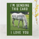 Cartão de aniversário com uma mensagem engraçada de cavalo! Estou mandando este cavalo grande (porque) Eu te amo. Imagem é uma fotografia de um cavalo branco pairando em um campo.