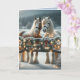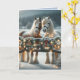 Cartão de Natal. Dois cavalos, um cavalo marrom e um cavalo branco parado atrás de uma cerca acendeu com luzes de Natal e coroas em um dia de neve.