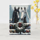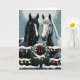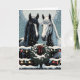 Bonito cartão de Natal com os gráficos de um cavalo branco e de um cavalo preto parado numa esteira de madeira decorada em passas de férias e bonito luzes de Natal cintilantes cobertas de neve. Estes cavalos são feitos em um estilo de arte de pop de quadrinhos para invocar um sentimento nostálgico Dentro de carta tem cavalo e trocadilho de Natal.