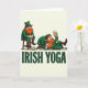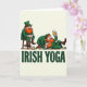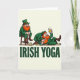 Este cartão mostra três duendes em um fundo cremoso, dispostos como uma engraçada pose de “ioga” após uma longa noite do Dia de São Patrício 💚. À esquerda, um senta-se em um banco rústico com uma expressão cansada, mas divertida, como se estivesse cuidando de seus amigos com carinho. Aos seus pés, um pequeno caneco de cerveja repousa perto de suas botas, sugerindo que a festa está acontecendo há um tempo ☘️. No centro, um duende está deitado quase plano em profunda relaxação, enquanto seu companheiro se apoia em um cotovelo, inclinando-se para perto enquanto levanta uma caneca espumosa acima da cabeça. Os trajes esmeralda e as barbas laranja brilhantes se destacam, e a caneca levantada mostra a cerveja dourada contra a roupa verde escura. Algumas garrafas vazias estão espalhadas ao