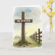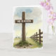 O desenho da frente mostra uma forma alta e vertical de madeira com uma travessa, ligeiramente descentralizada na parte da frente, com as palavras "ELE RESSUSCITOU" pintadas de branco na travessa horizontal. A madeira parece áspera e desgastada, e tufos de grama verde e brotos finos se acumulam na base como um sinal silencioso de nova vida 🌷. À direita, uma cerca de madeira desgastada se estende para o fundo, levando suavemente o olhar por um campo aberto que parece calmo e acolhedor. A terra se estende em tons suaves de verde, e a luz cai sobre ela como se fosse início da manhã, dando à cena um clima terno e íntimo. Acima, o céu muda de amarelo pálido perto do horizonte para azul suave e cinza opaco, criando um fundo calmante. O fundo tem uma aparência de aquarela, enquanto a textura da madeira e as bordas da cerca são mais definidas, adicionando textura e profundidade. A letra branca está centrada na travessa, destacando-se claramente contra a madeira mais escura 🐇. À distância, a cerca se estreita em direção a um ponto de