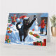 Uma ilustração animadora de feriado mostrando um gato alegre brincando na neve, vestindo um chapéu de Papai Noel e cercado por caixas coloridas de presentes. Ao fundo, as crianças constroem um boneco de neve ao lado de uma árvore de Natal coberta de neve, criando uma alegre terra maravilhosa do inverno. Perfeito por espalhar alegria e capturar a magia do Natal.