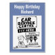 Cartão de aniversário para um trabalhador de garagem ou mecânico. Um centro de assistência a automóveis tem garrafas de bebidas espirituosas como "amortecedores" atrás do balcão de pagamento