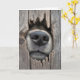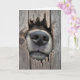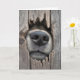 Fecho do nariz e da boca de um cão a vomitar através de um buraco fustigado numa cerca de madeira rústica por pensar em ti. O texto pode ser alterado.