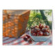 Uma tigela de cerejas maduras vermelhas está pronta para comer perto de um cesto de piquenique sob a sombra de maçã de uma árvore. O original é uma pintura em miniatura de óleo por Kathie Miller