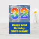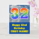 A frente desta divertida design de 32º aniversário apresenta uma representação de um céu azul nublado, juntamente com o número "32", tendo um espectro multicolorido de arco-íris como um aspecto gradiente. A frente também apresenta uma mensagem de saudação de aniversário, incluindo um nome de destinatário personalizado. O dentro apresenta uma mensagem de saudação de aniversário personalizada, ou talvez possa ser apagado e deixado vazio se uma mensagem for escrita manualmente. Um cartão de aniversário personalizado como este pode ser uma maneira divertida de enviar desejos de aniversário a alguém que comemora seus trinta e dois anos. [~Z0000370]