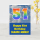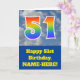 A frente deste divertido cartão de aniversário de 51 anos apresenta uma representação de um céu azul nublado, juntamente com o número "51" tendo um padrão de gradiente de espectro de arco-íris multicolorido. A frente também apresenta uma mensagem de saudação de aniversário, incluindo um nome de destinatário personalizável. O interior apresenta uma mensagem de saudação de aniversário personalizada, ou talvez possa ser limpo e deixado em branco se uma mensagem for escrita à mão. Um cartão de aniversário personalizado como este pode ser uma maneira divertida de reconhecer o aniversário de cinquenta e um anos de alguém.
