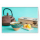 Chá para uma pessoa com bule de ferro fundido, chaleira de barro feita à mão, caixa de chá e dois scones de queijo.