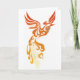Um phoenix voa fora das chamas alaranjadas e amarelas.