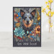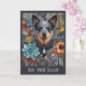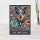 Imagem de um Cão de Bovinos australiano com flores indígenas australianas e borboleta azul. O texto diz "Vai Bem Logo". Enviando abraços e amor à medida que se recupera. Cartão de saudação personalizável com a opção de alterar texto e imagens clicando em Personalizar este modelo.